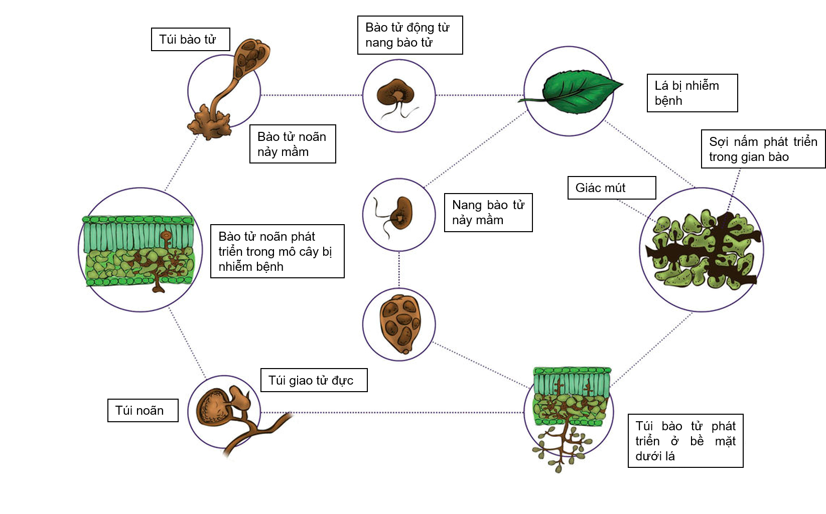 Nấm sương mai sau khi xâm nhập vào trong tế bào kí chủ sẽ sinh trưởng, phát triển và gây hại bên trong tế bào. Sự phát triển mạnh các sợi nấm bên trong mô tế bào sẽ làm phá vỡ các mô và cơ quan biểu bì của lá, khiến cho lá nhiễm nấm sương mai có hiện tượng bị quăn và biến dạng.