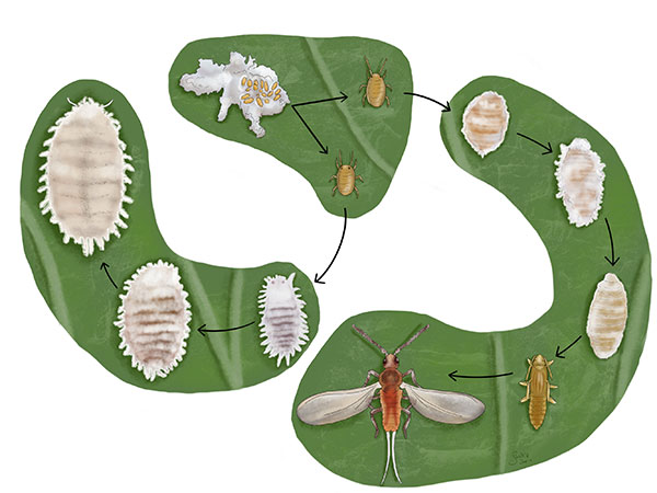 Rệp sáp gây hại vùng rễ và tất cả các bộ phận của cây chủ yếu là tán lá và trái. Khi rệp sáp tấn công vùng rễ, làm cho lá cây bị hại héo vàng úa có thể nhầm với triệu chứng bị khô hạn. Rễ đôi khi bị khảm một lớp mô nấm màu trắng xanh và bị còi cọc. Rệp sáp Planococcus citri có khả năng di chuyển hoạt động tích cực trong suốt đời sống của chúng. Con đực sống khoảng 27 ngày (từ khi nở cho đến khi trưởng thành và chết), còn đối với con cái sống khoảng 115 ngày. Vòng đời (từ trứng cho đến khi đẻ trứng) biến thiên từ 20 đến 44 ngày.